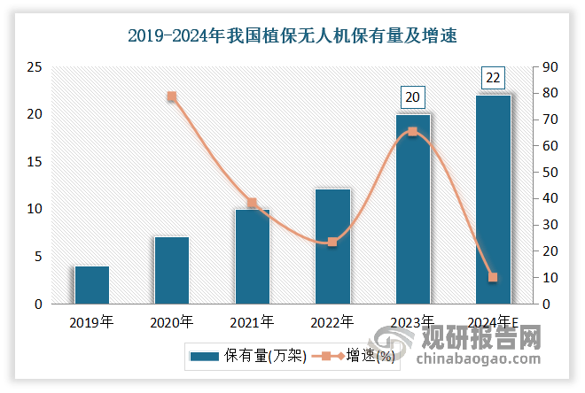 跟着植保无人机正在全国各地推广普及,保有量呈现增加态势。2019-2023年我国植保无人机保有量由4万架增加至20万架,估计2024年我国植保无人机保有量达22万架,较上年同比增加10%。